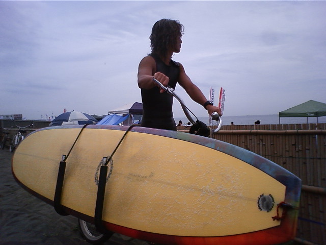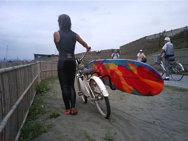 自宅からウェットを着て板を自転車にくくりつけ海に向かい波に乗る。 この感じがとても羨ましい。